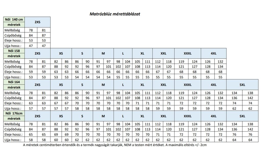 | Választható méretek: | 140, 158, 164, 176 2XS – 5XL |